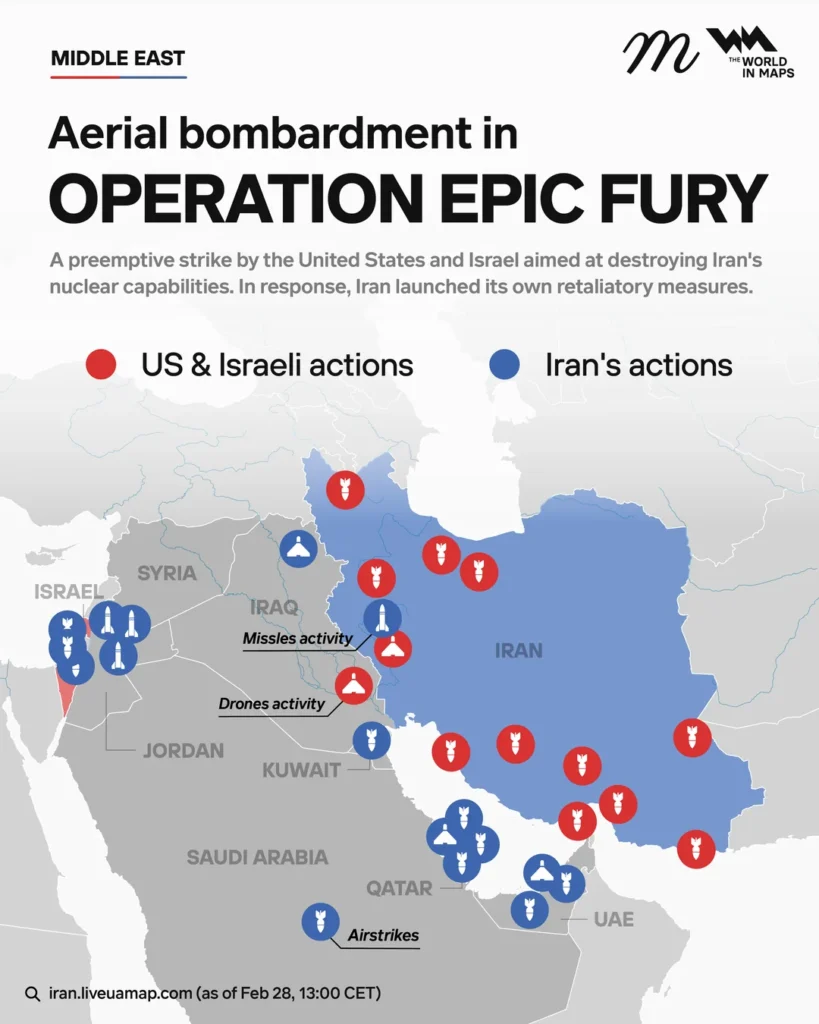 In the early hours of February 28, 2026, the United States and Israel launched a coordinated military offensive against Iran, dubbed Operation Epic Fury by U.S. forces and Operation Roaring Lion by Israel. This operation, described by U.S. President Donald Trump as a “massive and ongoing” campaign, represents the most significant joint U.S.-Israeli military action in history and the largest American-led war effort since Operation Desert Storm in 1991. The strikes targeted Iran’s nuclear facilities, missile production sites, military installations, naval assets, government ministries, and senior regime leadership, including the assassination of Supreme Leader Ayatollah Ali Khamenei. As of March 1, the conflict has entered its second day, with Iran retaliating through missile and drone attacks on U.S. bases, Israeli cities, and allied Gulf states, resulting in the first confirmed U.S. combat deaths: three service members killed and five seriously wounded.